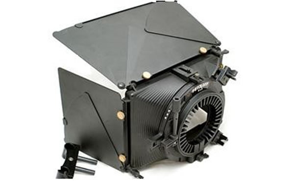 O Matte Box é modular, com dois estágios de filtro, bandeira superior, bandeiras laterais e um suporte universal Petroff.